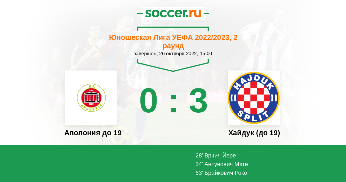 Протокол матча Аполония до 19 против Хайдук (до 19)