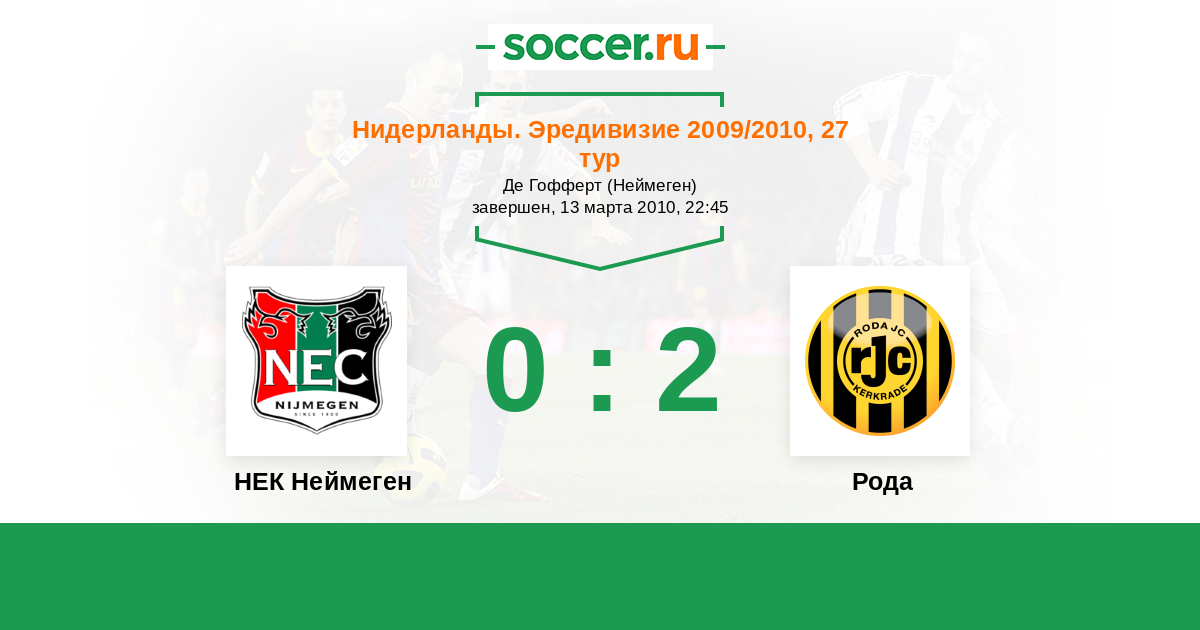 Нидерланды. Эредивизи 26.10.2010 Рода Логотип футбольный клуб Рода (Керкраде) 1:1 Логотип футбольный клуб НЕК Неймеген НЕК Неймеген