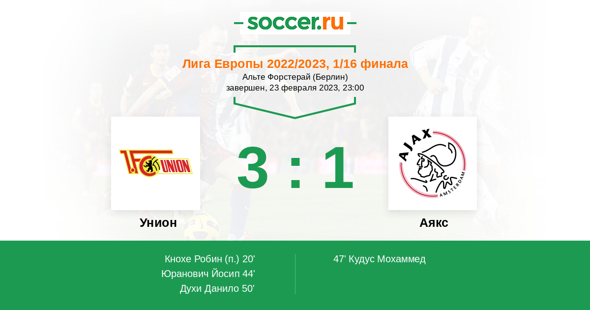 Унион - Аякс ! Первый матч между этими командами закончился нулевой ничьей . В этом матче жду голы ,прежде всего от гостей , которые отличаются заметной результативностью в своём чемпионате . ТБ2 (1)