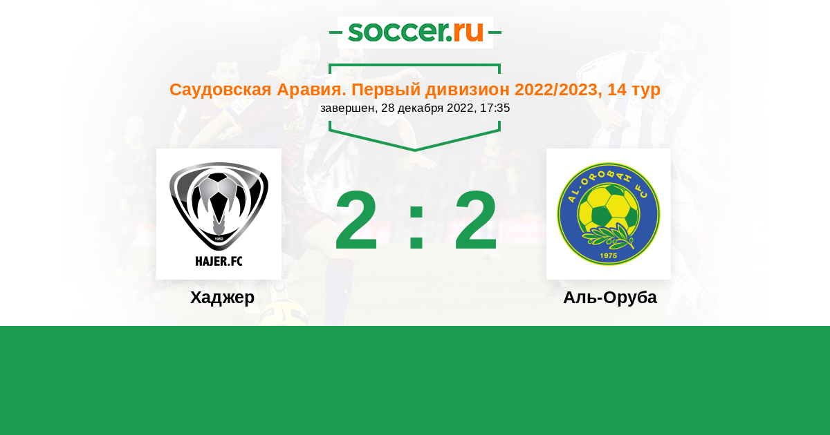 Саудовская Аравия. Первый дивизион 30.03.2022 Хаджер Логотип футбольный клуб Хаджер (Эль-Хофуф) 0:0 Логотип футбольный клуб Аль-Оруба (Сакака) Аль-Оруба