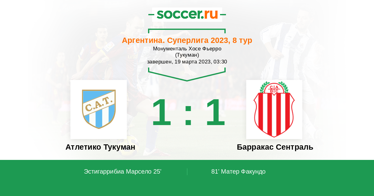 81' (1:1) Матер Факундо (33) (Сентурион Адриан (23))