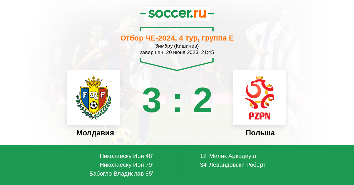 Это мягко сказано..))) Хотя, я не исключал что Молдова может дать БОЙ и желал им победы, а то видел польских футболистов перед матчем очень гордых и с неким высокомерием, смотрели на молдавских футболистов свысока. Ну, те поняли намёк и опустили их.... с небес..)))