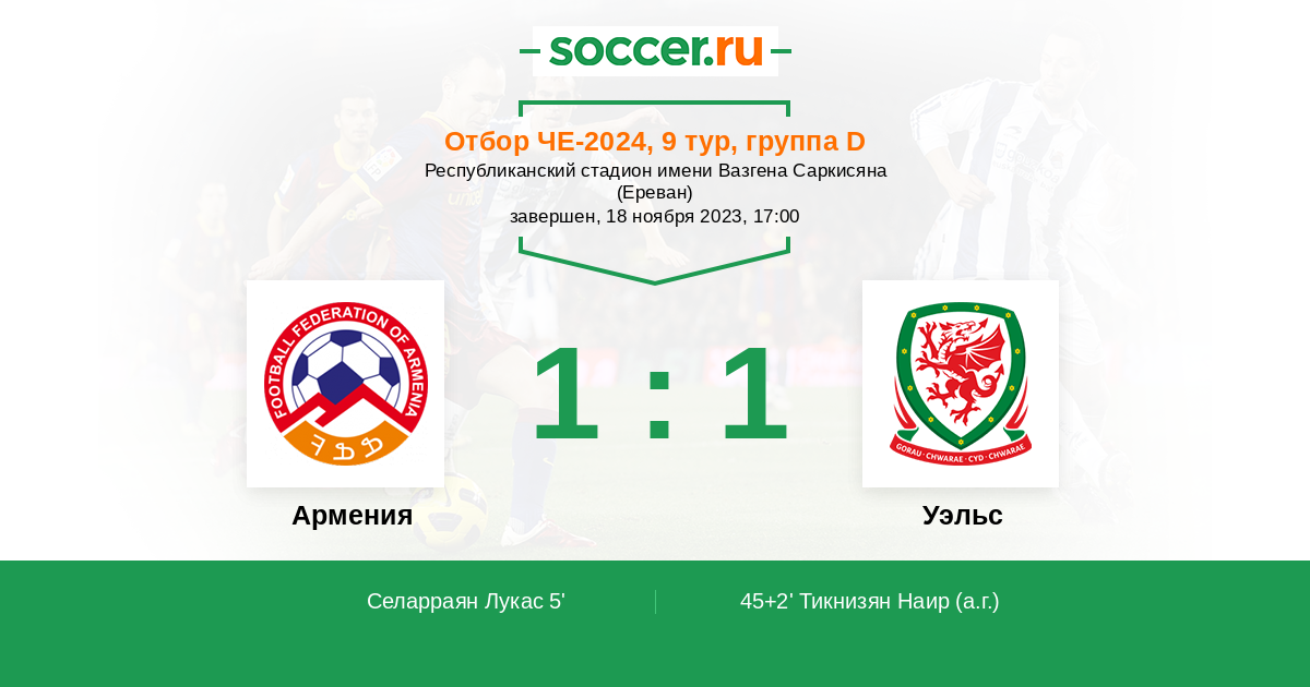 Армения - Уэльс ! Обоим клубам надо играть только на победу , шансы ещё не утрачены у обеих команд . Первая их встреча прошла на редкость результативно - жду нечто похожее.