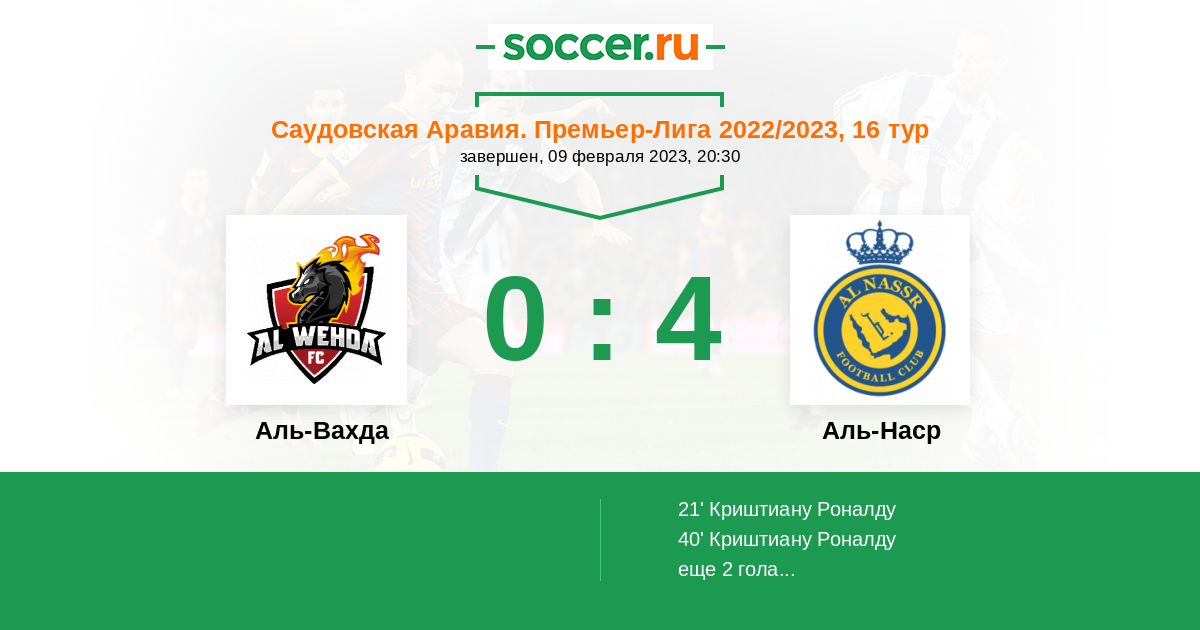 40' (0:2) Криштиану Роналду (7) (Аль Наджи Сами (14))