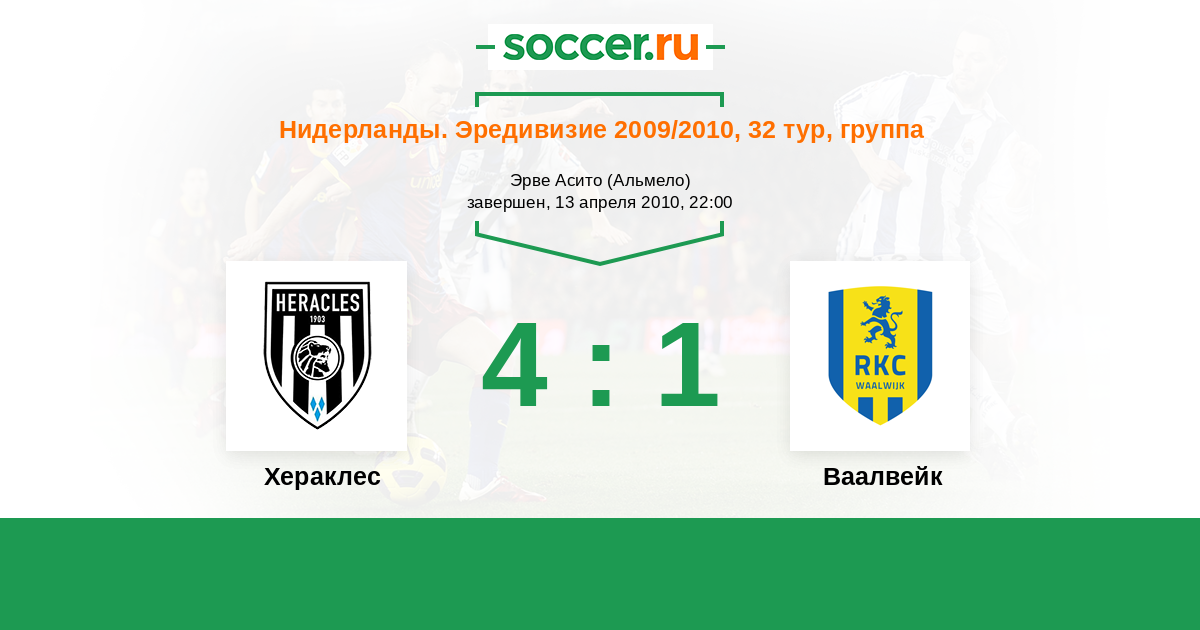 Нидерланды. Эредивизи 20.04.2013 Хераклес Логотип футбольный клуб Хераклес (Алмело) 4:0 Логотип футбольный клуб Ваалвейк (Валвейк) Ваалвейк