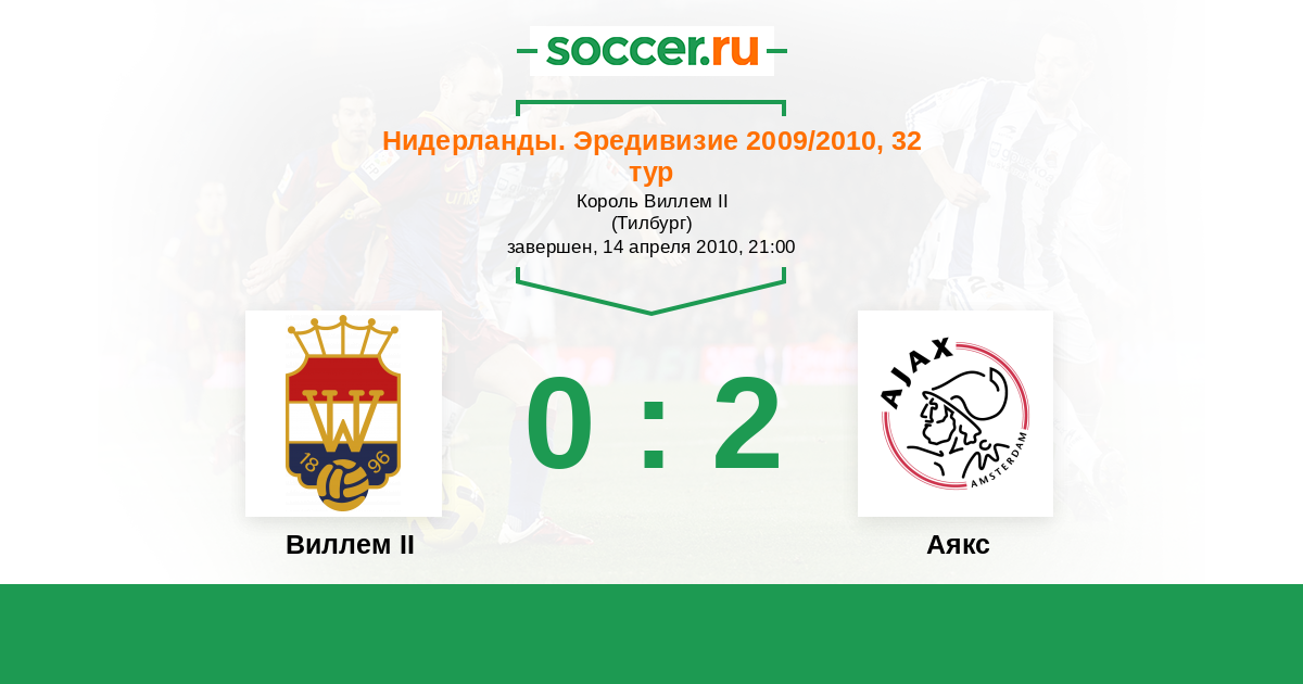 Нидерланды. Эредивизи 12.04.2009 Аякс Логотип футбольный клуб Аякс (Амстердам) 7:0 Логотип футбольный клуб Виллем II (Тилбург) Виллем II