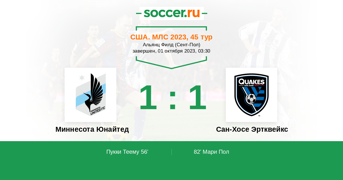 Протокол матча Миннесота Юнайтед против Сан-Хосе Эртквейкс