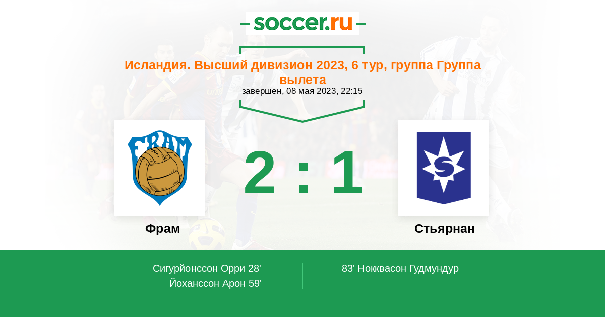 83' (2:1) Нокквасон Гудмундур (18) (Сигургеирссон Исак (7))