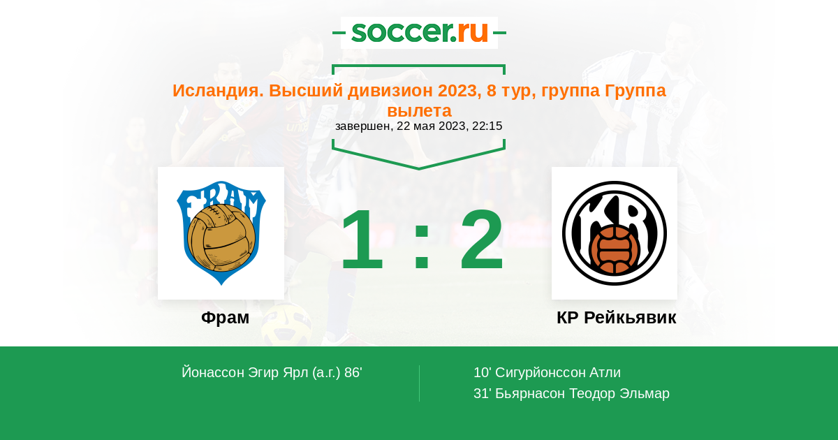 86' (1:2) Автогол Йонассон Эгир Ярл (14)
