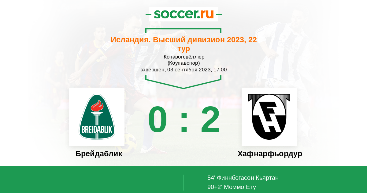 54' (0:1) Финнбогасон Кьяртан (9) (Асгримссон Харальдур (3))