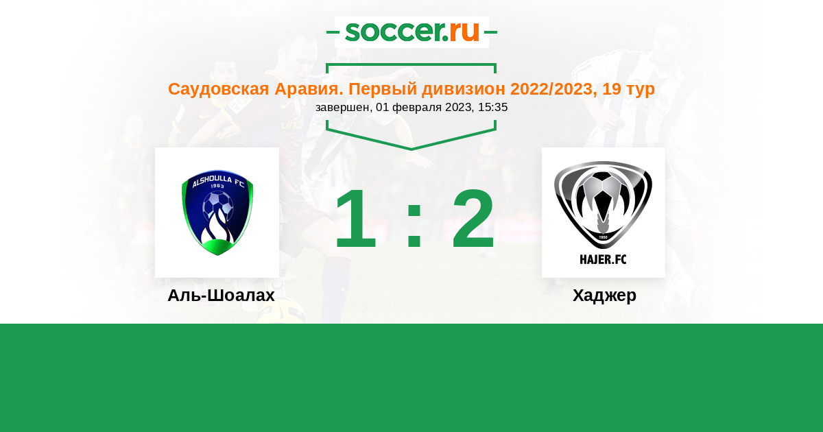 Саудовская Аравия. Первый дивизион 26.02.2019 Хаджер Логотип футбольный клуб Хаджер (Эль-Хофуф) 1:1 Логотип футбольный клуб Аль-Шоалах (Эль-Хардж) Аль-Шоалах