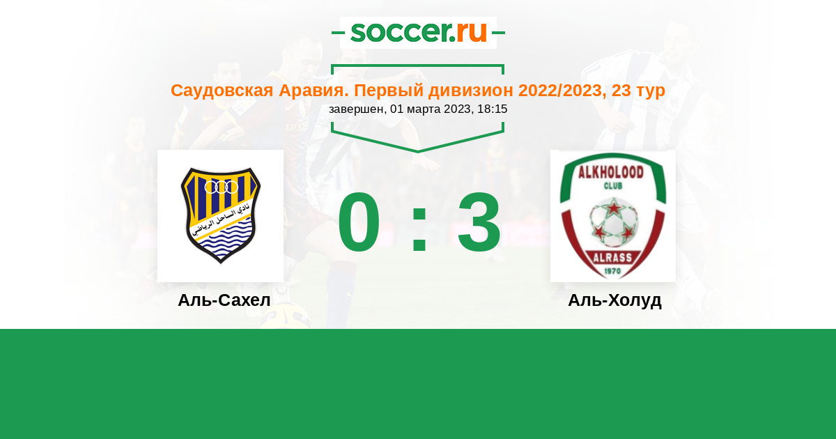 Я думаю что в этом противостоянии более чем явного фаворита на победу нет . Команда хозяев поля Аль - Сахел которая находится среди аутсайдеров , наверняка будет бороться за победу , но и команда гостей Аль - Холуд не будет мальчиками для битья . И скорее всего этот матч закончится в ничью.