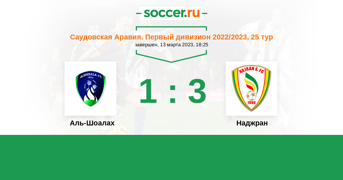 Саудовская Аравия. Первый дивизион 13.03.2018 Наджран Логотип футбольный клуб Наджран 2:0 Логотип футбольный клуб Аль-Шоалах (Эль-Хардж) Аль-Шоалах