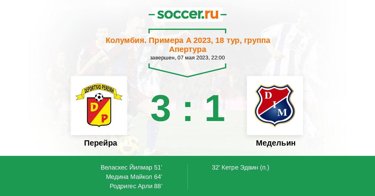 64' (2:1) Медина Майкол (18) (Зулуага Хуан (13))