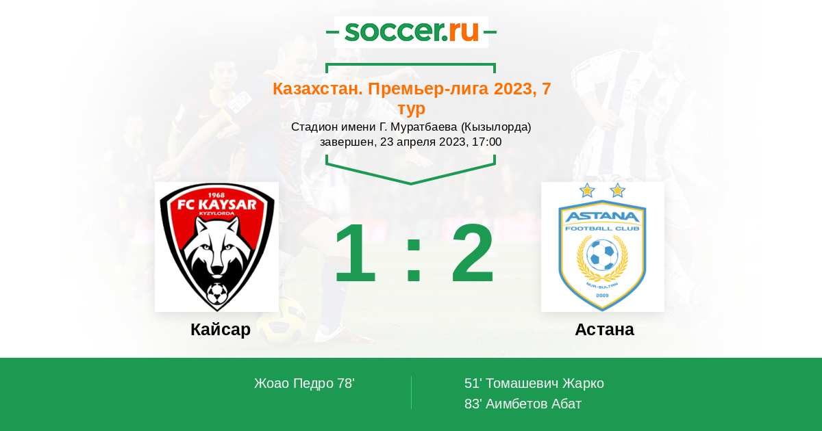 В предстоящем матче 7 - го тура казахстанской Примеьер - Лиги между командами Кайсар и Астана , более чем явным фаворитом на победу является команда гостей Астана , так как они играют лучше.