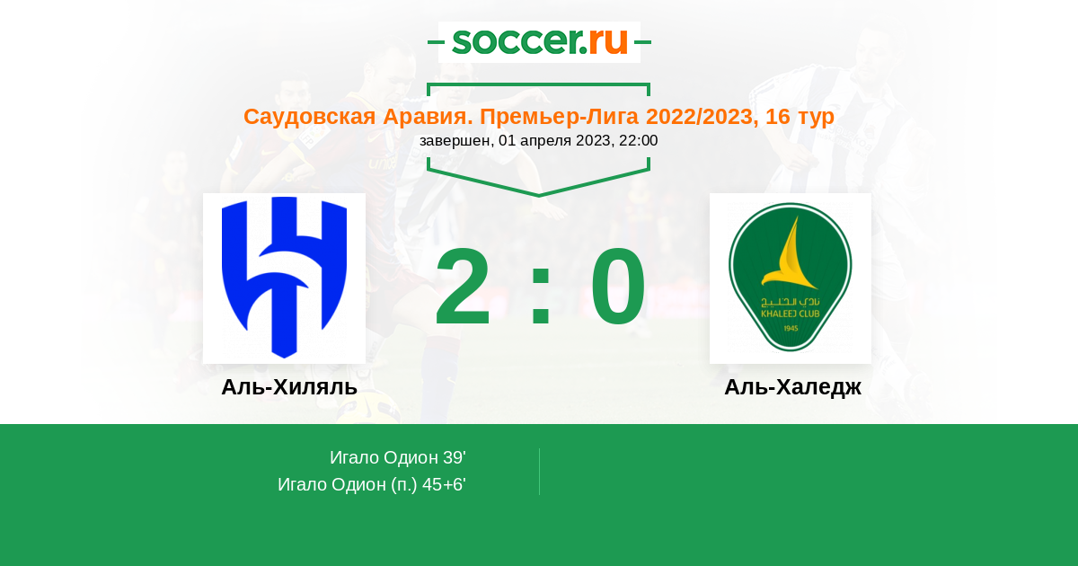 39' (1:0) Игало Одион (9) (Аль-Бурайк Мухаммед (2))