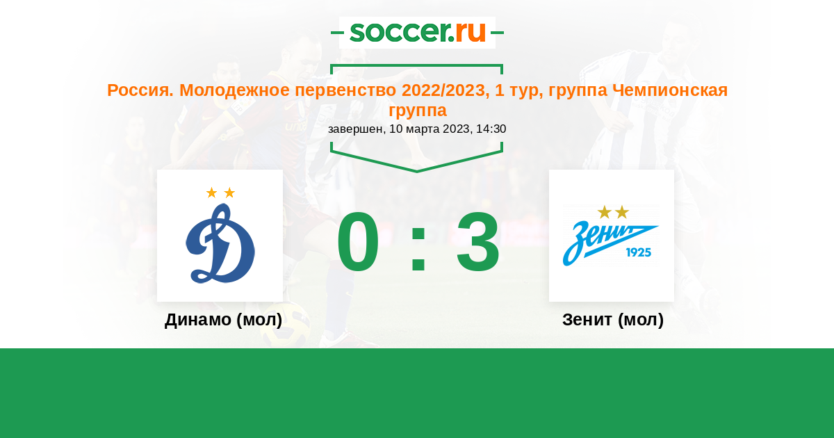 Россия. Премьер-Лига U21 15.03.2024 Динамо (мол) Логотип футбольный клуб Динамо (мол) (Москва) 1:2 Логотип футбольный клуб Зенит (мол) (Санкт-Петербург) Зенит (мол)