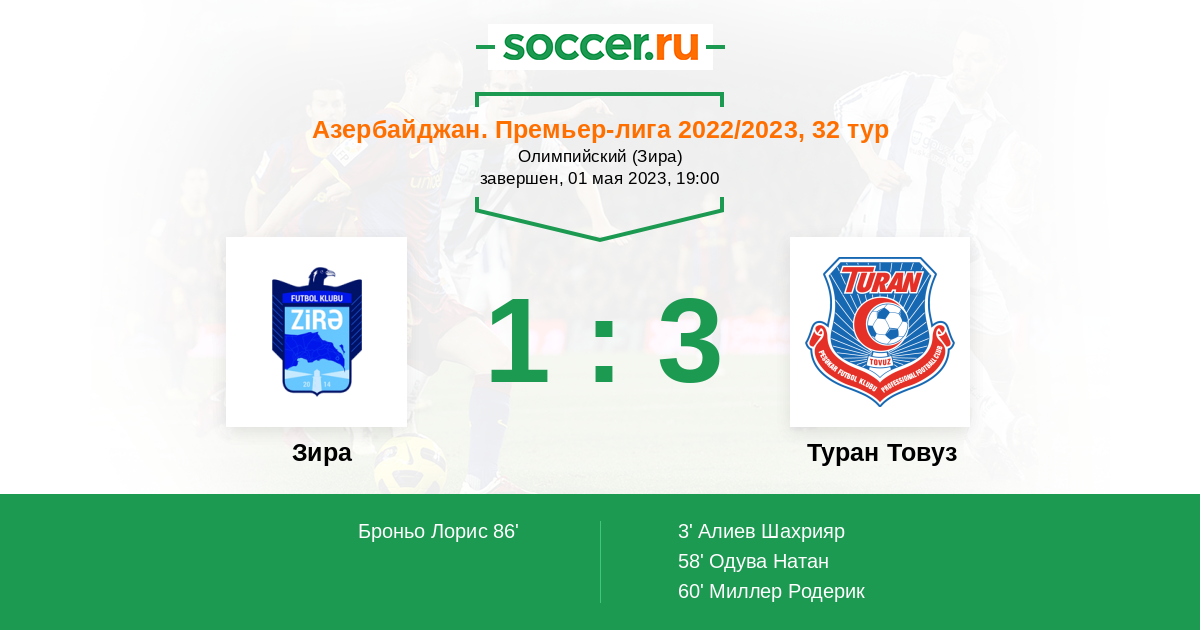 Протокол матча Зира против Туран Товуз