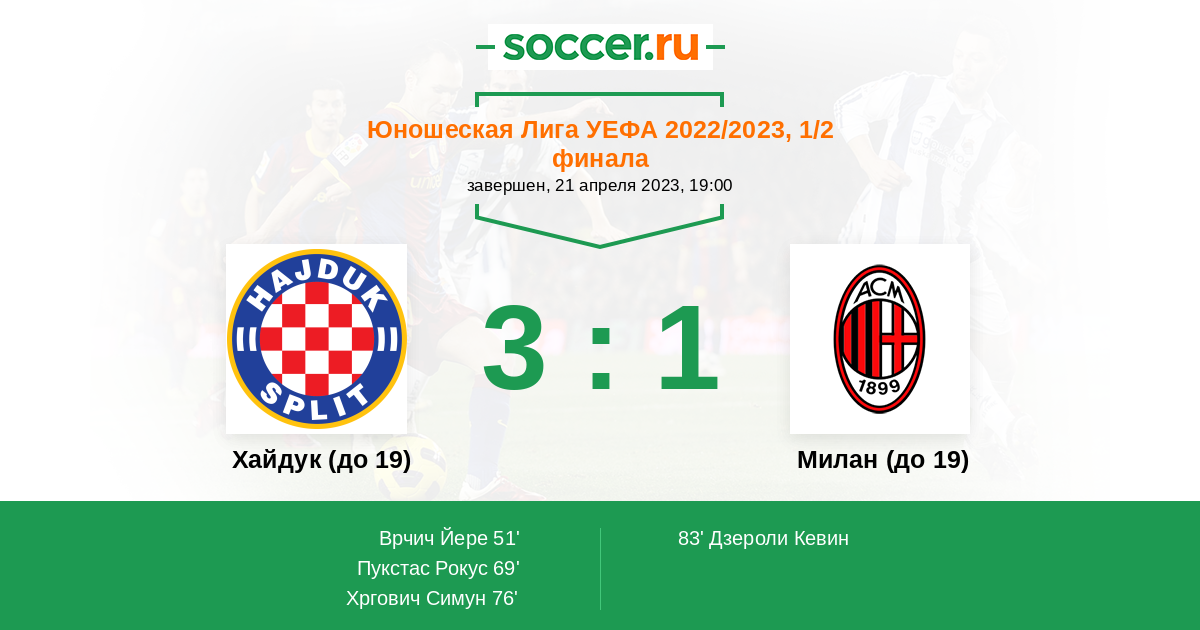 Протокол матча Хайдук (до 19) против Милан (до 19)