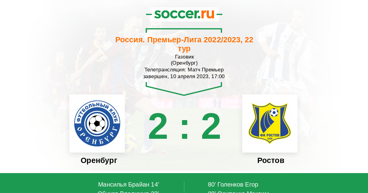 Счет 2 ; 2 в сегодняшнем матче на фоне вышеперечисленных результатов надо признать удовлетворительным, если принимать во внимание существенные кадровые проблемы Ростова перед игрой с Оренбургом (Уткин, Глебов, Полоз). Ветераны и Молодежь Ростова нашли силы выравнять игру во втором тайме и сравнять счет. Молодцы!