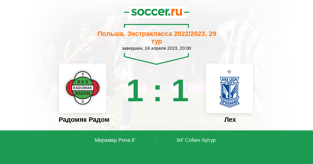 Я думаю что в этом противостоянии более чем явным фаворитом на победу является команда гостей Лех , которая находится в верхней части турнирной таблицы и борется за попадание в зону еврокубковых матчей . А команда хозяев поля Радомяк Радом в нижней части турнирной таблицы и борется за выживание .