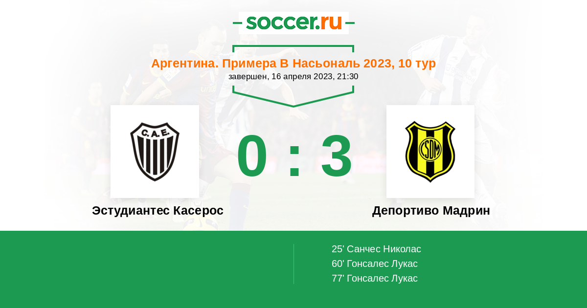 Протокол матча Эстудиантес Касерос против Депортиво Мадрин