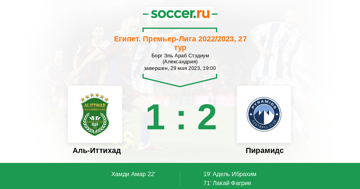 71' (1:2) Лакай Фагрие (23) (Собхи Рамадан (10))