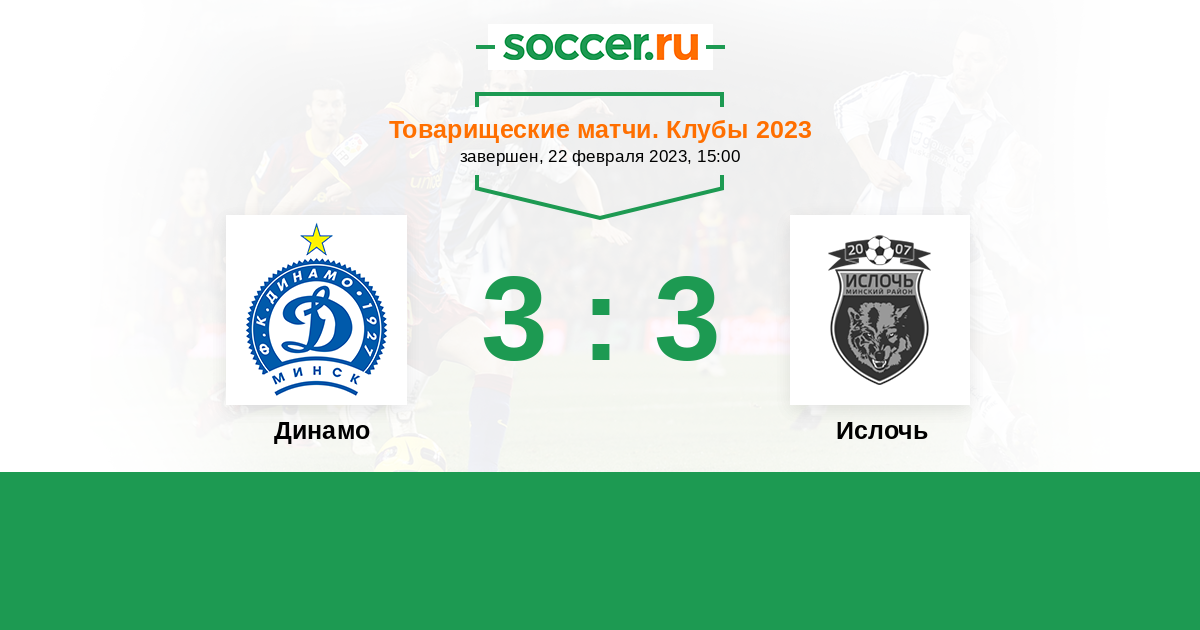 Беларусь. Высшая лига 18.03.2023 Динамо Логотип футбольный клуб Динамо (Минск) 3:0 Логотип футбольный клуб Ислочь (Минск) Ислочь