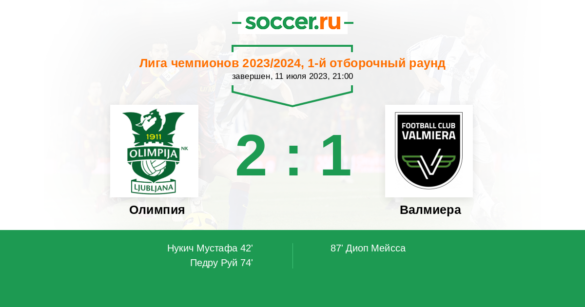 В предстоящем матче 1 - го отборочного раунда Лиги Чемпионов УЕФА 2023/2024 между командами Олимпия Любляна и Вальмиера, более чем явным фаворитом на победу является команда хозяев Олимпия Любляна .