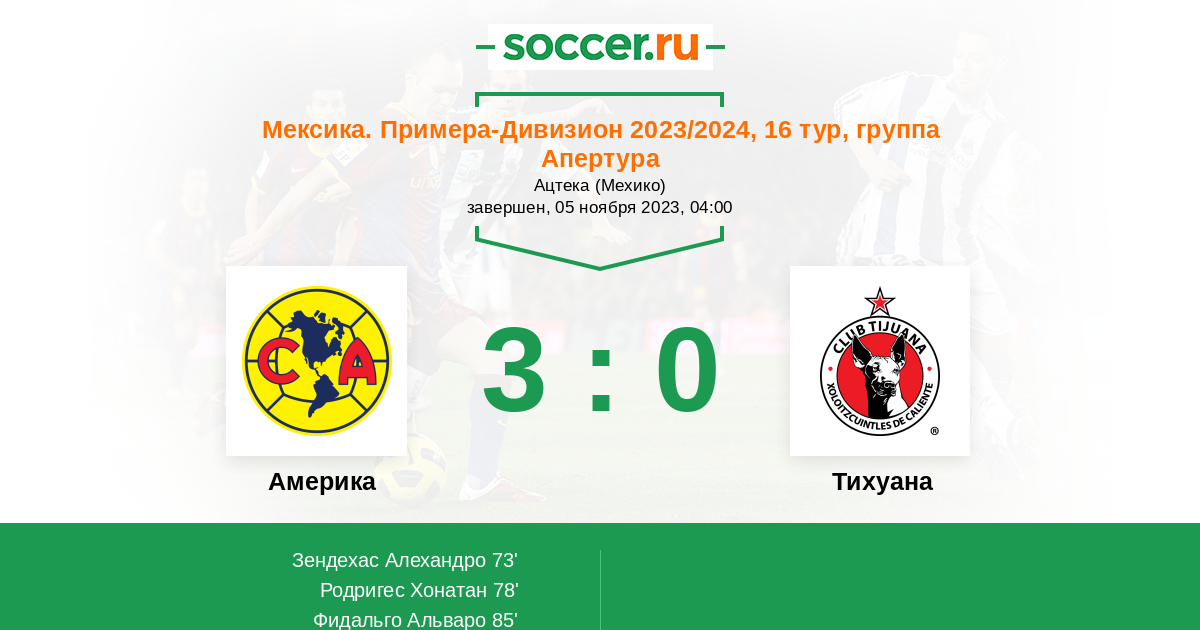 73' (1:0) Зендехас Алехандро (17) (Мартин Мекс Генри (21))