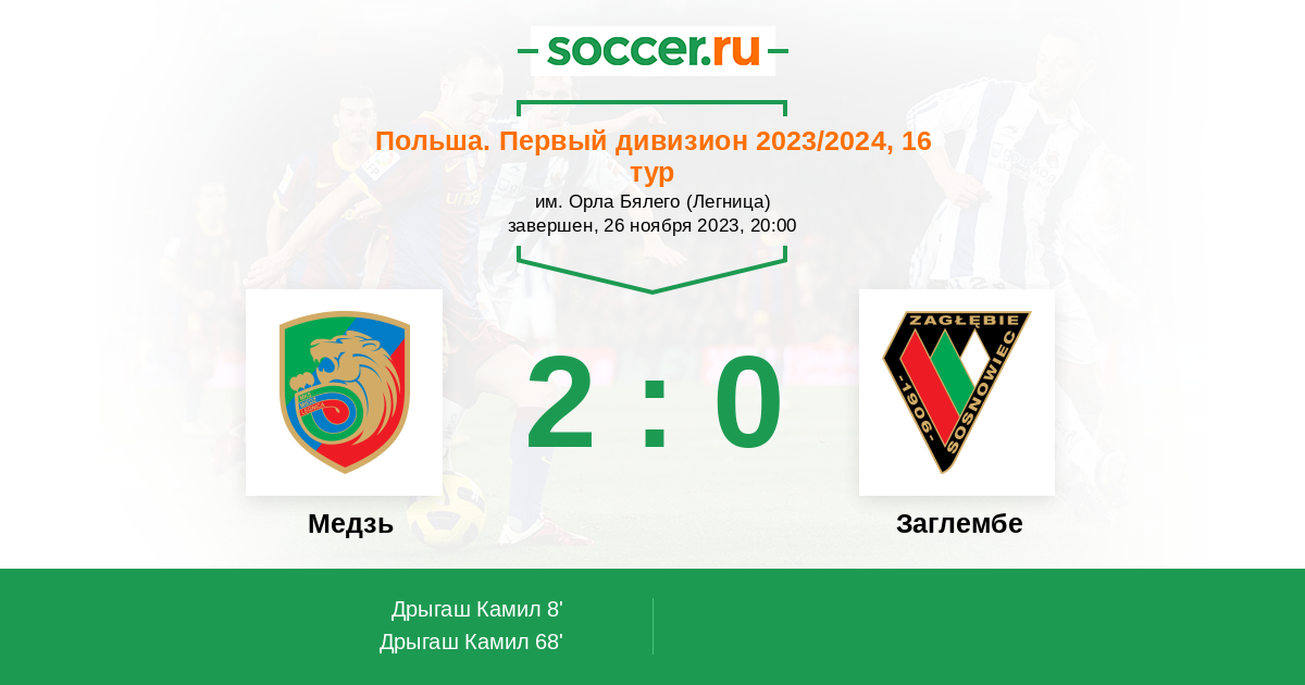 Протокол матча Медзь против Заглембе