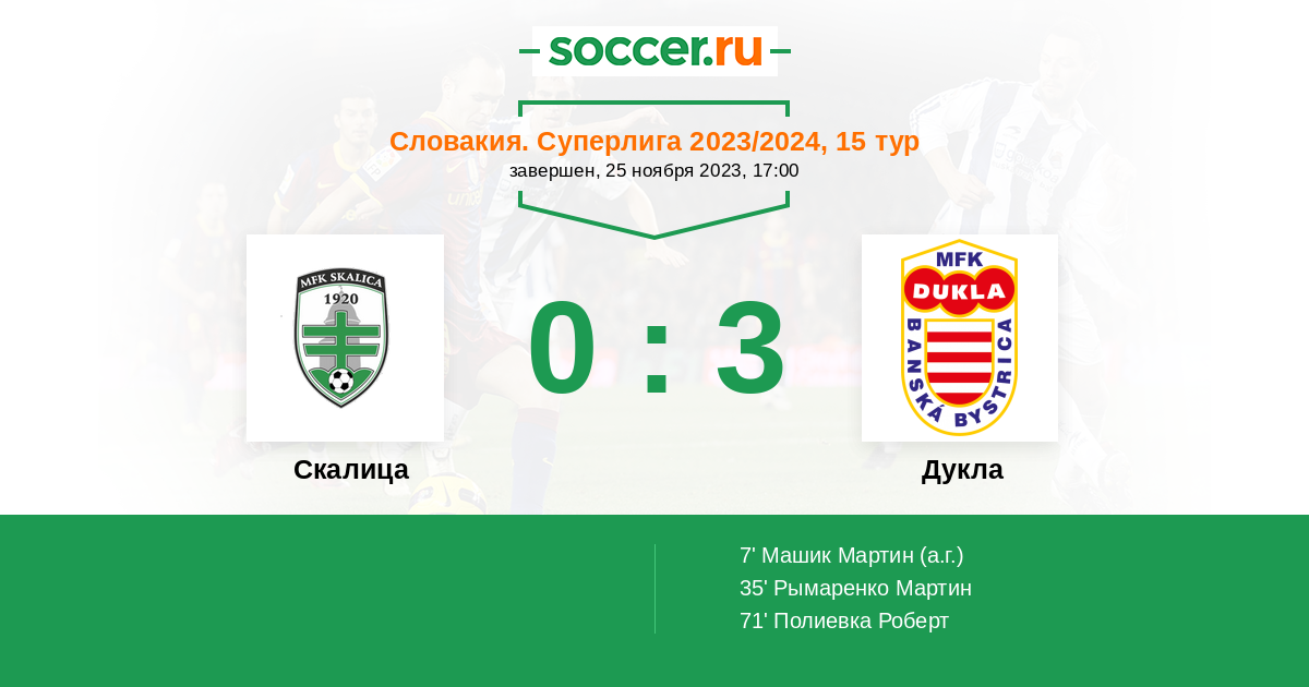 7' (0:1) Автогол Машик Мартин (19)