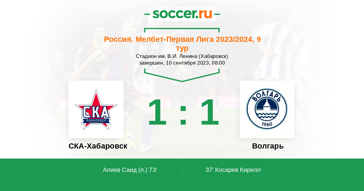 В предстоящем матче 9- го тура российской Первой Лиги между командами СКА-Хабаровск и Волгарь, более чем явным фаворитом на победу является команда хозяев СКА-Хабаровск, так как они играют дома, а другим трудно играть в таких условиях.