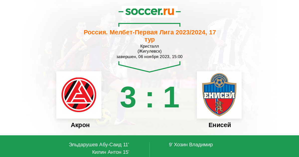 Протокол матча Акрон против Енисей
