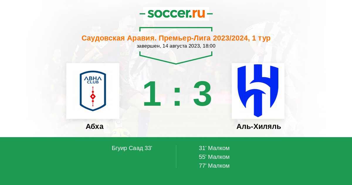 55' (1:2) Малком (77) (Аль-Бурайк Мухаммед (2))