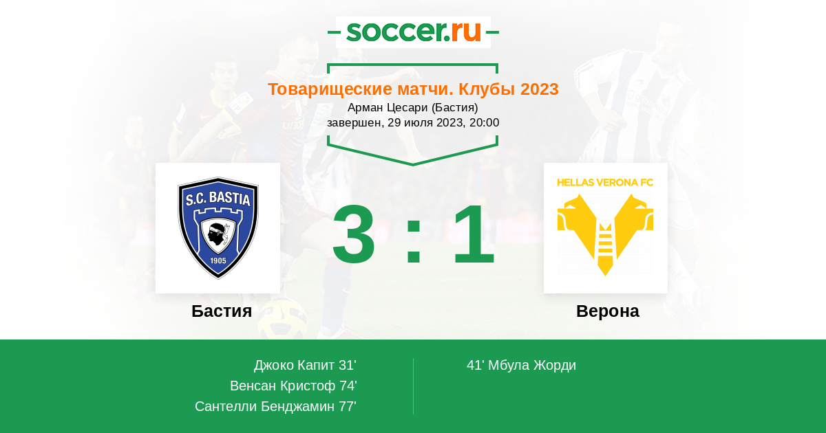 Протокол матча Бастия против Верона