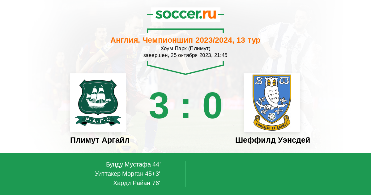 Протокол матча Плимут Аргайл против Шеффилд Уэнсдей