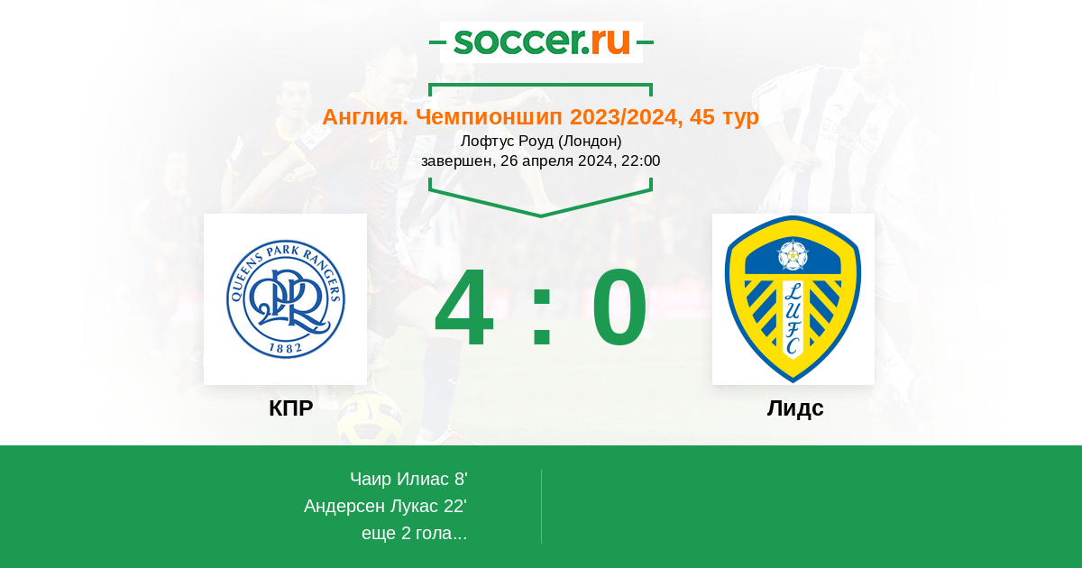 Лидс продолжает борьбу не только за возвращение в АПЛ, но и за чемпионство. КПР борется за выживание – пока лондонцы в четырех очках над зоной вылета. Оба соперника максимально мотивированы.