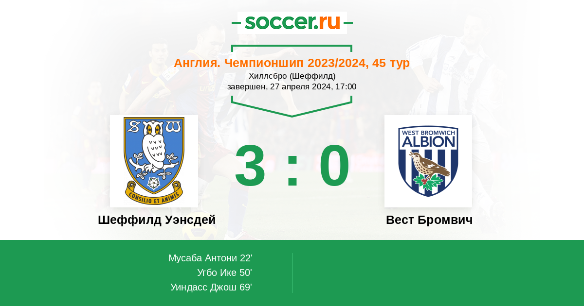 Протокол матча Шеффилд Уэнсдей против Вест Бромвич