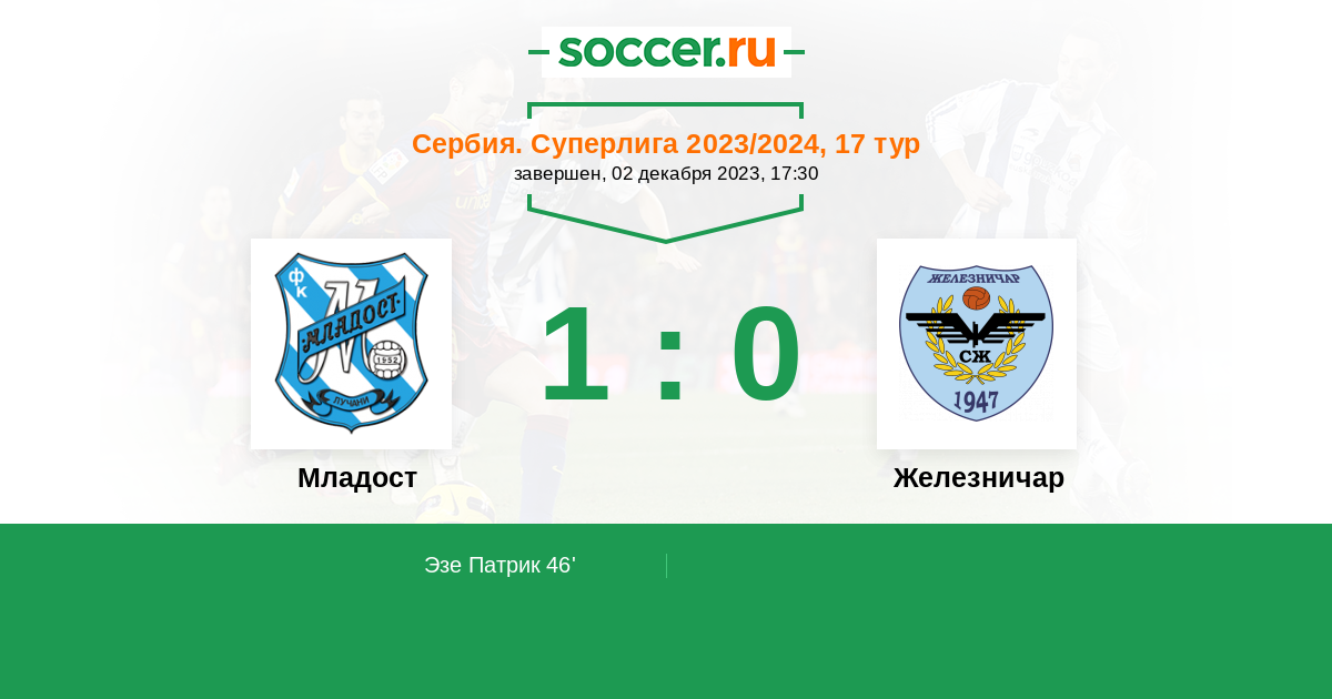 46' (1:0) Эзе Патрик (45) (Чиркович Никола (30))