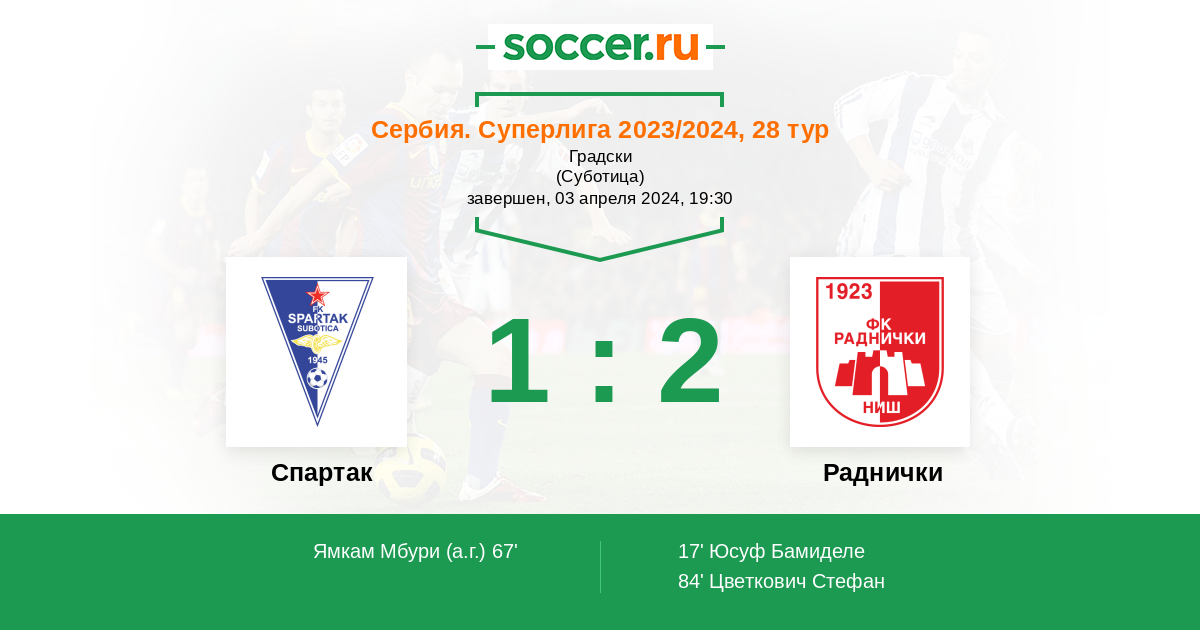 Протокол матча Спартак Суботица против Раднички