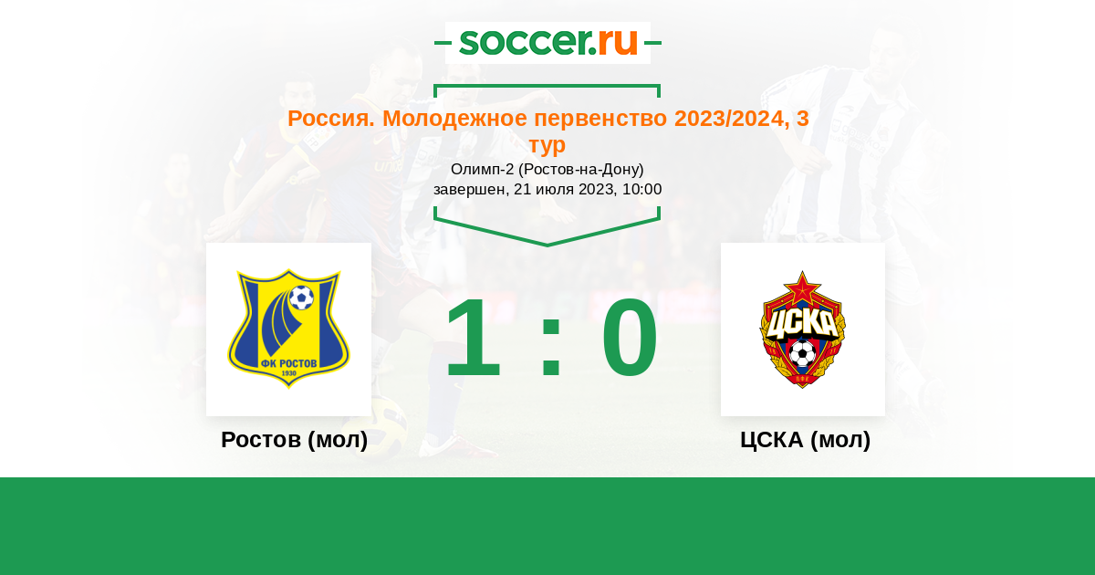 Россия. Премьер-Лига U21 31.03.2023 Ростов (мол) Логотип футбольный клуб Ростов (мол) (Ростов-на-Дону) 1:0 Логотип футбольный клуб ЦСКА (мол) (Москва) ЦСКА (мол)