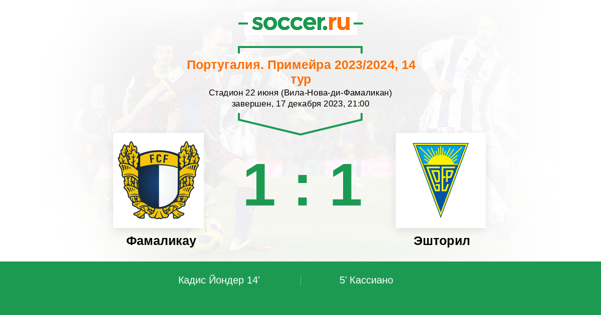 14' (1:1) Кадис Йондер (29) (Са Густаву (20))