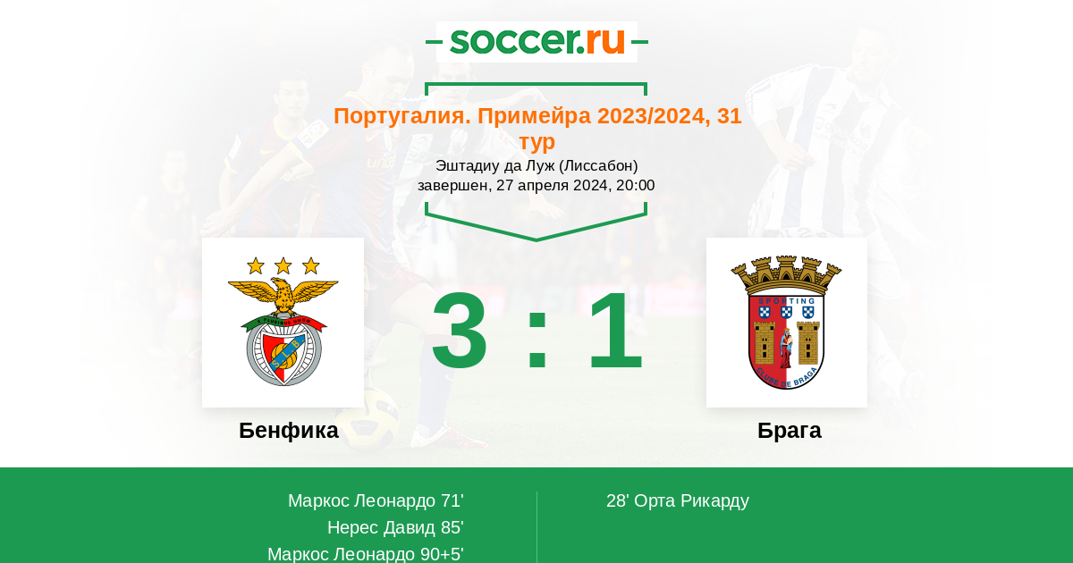 Протокол матча Бенфика против Брага