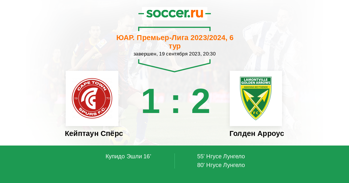 55' (1:1) Нгусе Лунгело (40) (Ндвандве Велемсени (12))