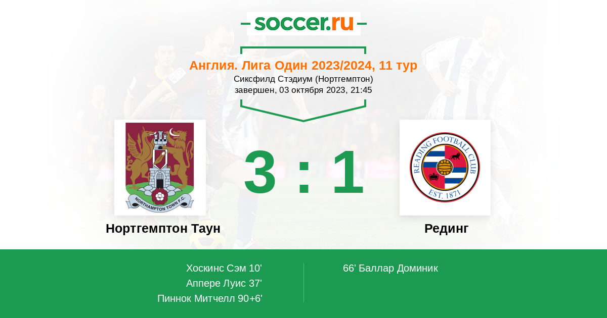 Протокол матча Нортгемптон Таун против Рединг