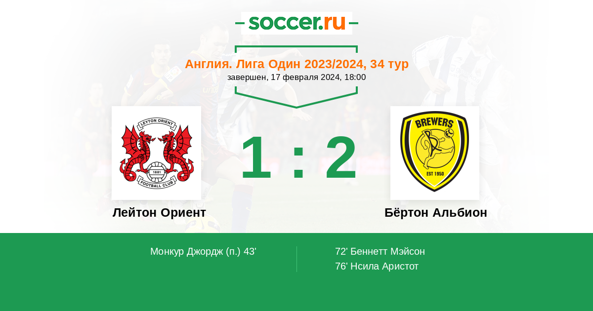 Протокол матча Лейтон Ориент против Бёртон Альбион