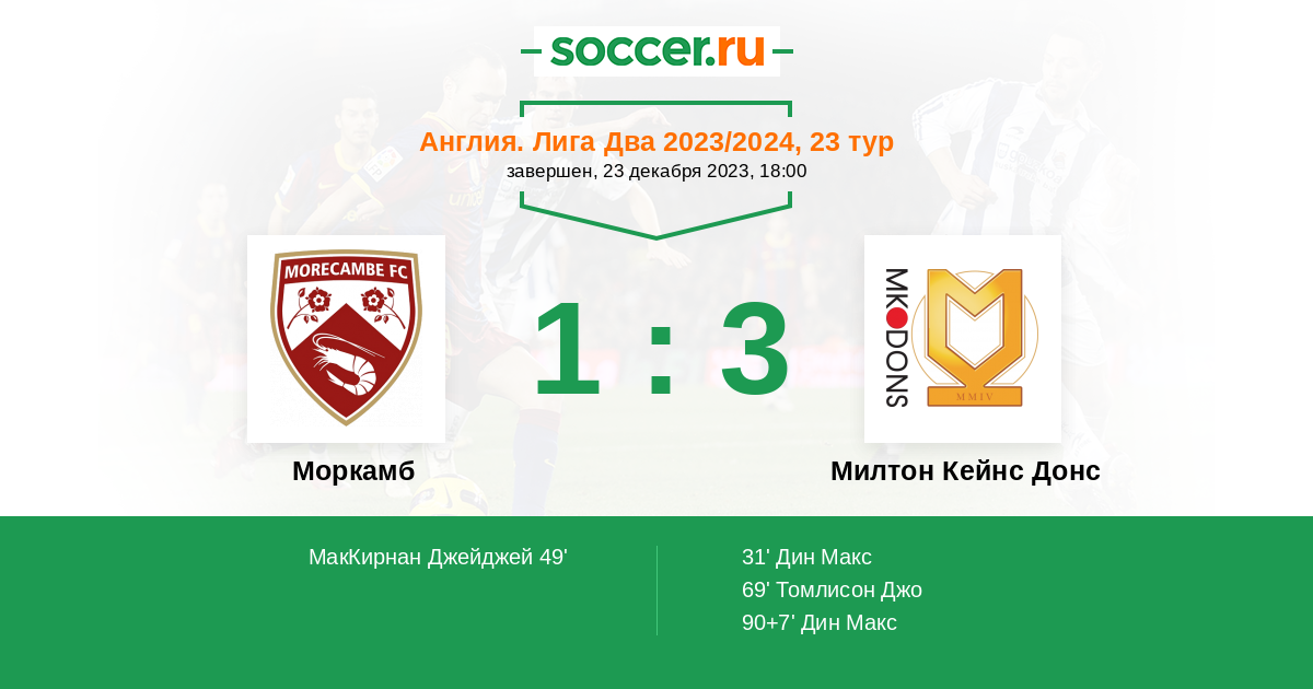 Протокол матча Моркамб против Милтон Кейнс Донс