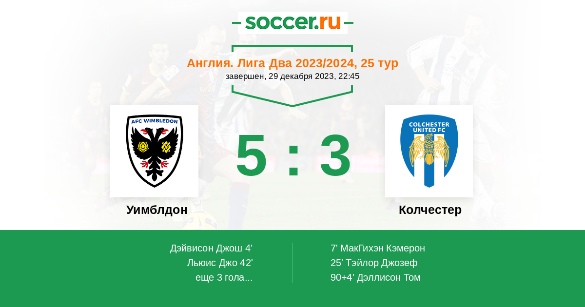 Протокол матча Уимблдон против Колчестер