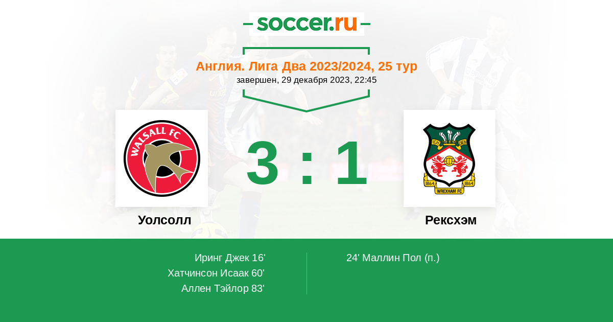 24' (1:1) Маллин Пол (10)